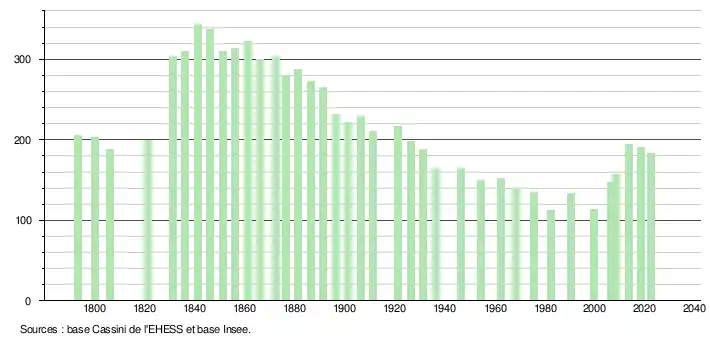 L'évolution du nombre d'habitants est connue à travers les recensements de la population effectués dans la commune depuis 1793. Pour les communes de moins de 10 000 habitants, une enquête de recensement portant sur toute la population est réalisée tous les cinq ans, les populations de référence des années intermédiaires étant quant à elles estimées par interpolation ou extrapolation[36]. Pour la commune, le premier recensement exhaustif entrant dans le cadre du nouveau dispositif a été réalisé en 2008[37].