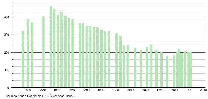 L'évolution du nombre d'habitants est connue à travers les recensements de la population effectués dans la commune depuis 1793. Pour les communes de moins de 10 000 habitants, une enquête de recensement portant sur toute la population est réalisée tous les cinq ans, les populations de référence des années intermédiaires étant quant à elles estimées par interpolation ou extrapolation[14]. Pour la commune, le premier recensement exhaustif entrant dans le cadre du nouveau dispositif a été réalisé en 2004[15].