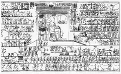 Extrait de l'inscription : « les chefs de tous les pays étrangers présentent des produits au roi et lui demandent la paix, afin qu'ils puissent respirer le souffle de vie. »[57]
