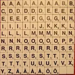 En suédois (le jeu a longtemps été commercialisé sous le nom d'Alfapet), il y a 100 jetons (pas de Q ni W) :