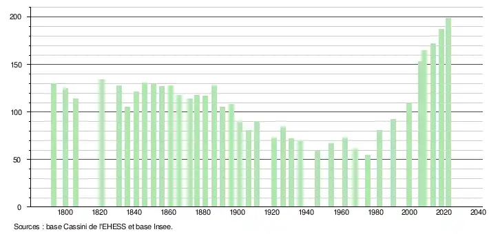 L'évolution du nombre d'habitants est connue à travers les recensements de la population effectués dans la commune depuis 1793. Pour les communes de moins de 10 000 habitants, une enquête de recensement portant sur toute la population est réalisée tous les cinq ans, les populations de référence des années intermédiaires étant quant à elles estimées par interpolation ou extrapolation[22]. Pour la commune, le premier recensement exhaustif entrant dans le cadre du nouveau dispositif a été réalisé en 2008[23].
