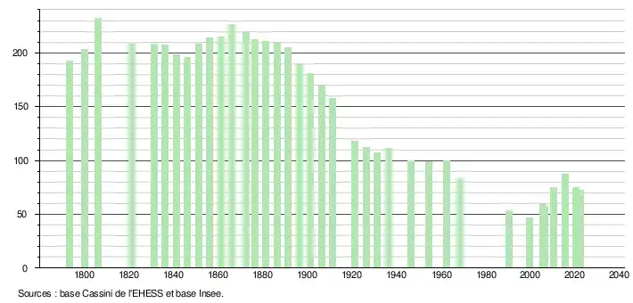 L'évolution du nombre d'habitants est connue à travers les recensements de la population effectués dans la commune depuis 1793. Pour les communes de moins de 10 000 habitants, une enquête de recensement portant sur toute la population est réalisée tous les cinq ans, les populations de référence des années intermédiaires étant quant à elles estimées par interpolation ou extrapolation[13]. Pour la commune, le premier recensement exhaustif entrant dans le cadre du nouveau dispositif a été réalisé en 2005[14].