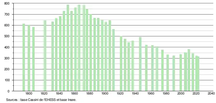 L'évolution du nombre d'habitants est connue à travers les recensements de la population effectués dans la commune depuis 1793. Pour les communes de moins de 10 000 habitants, une enquête de recensement portant sur toute la population est réalisée tous les cinq ans, les populations de référence des années intermédiaires étant quant à elles estimées par interpolation ou extrapolation[16]. Pour la commune, le premier recensement exhaustif entrant dans le cadre du nouveau dispositif a été réalisé en 2005[17].