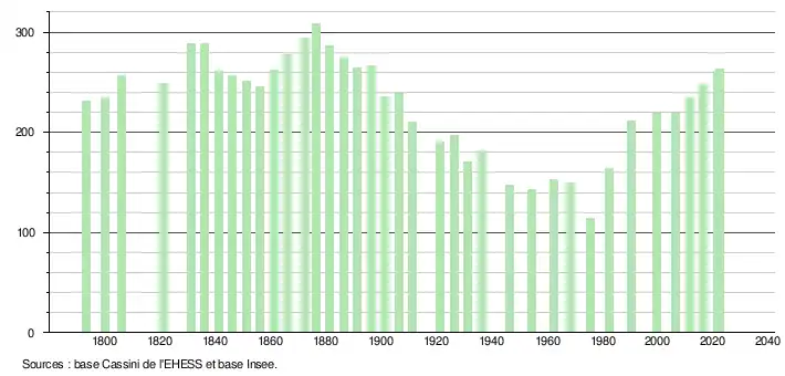 L'évolution du nombre d'habitants est connue à travers les recensements de la population effectués dans la commune depuis 1793. Pour les communes de moins de 10 000 habitants, une enquête de recensement portant sur toute la population est réalisée tous les cinq ans, les populations de référence des années intermédiaires étant quant à elles estimées par interpolation ou extrapolation[41]. Pour la commune, le premier recensement exhaustif entrant dans le cadre du nouveau dispositif a été réalisé en 2006[42].