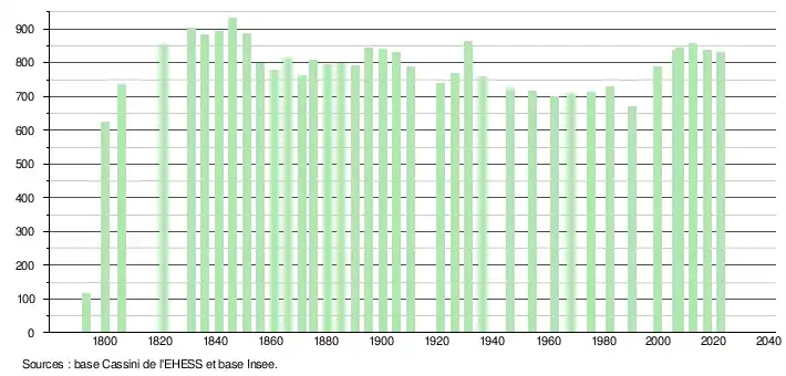 L'évolution du nombre d'habitants est connue à travers les recensements de la population effectués dans la commune depuis 1793. Pour les communes de moins de 10 000 habitants, une enquête de recensement portant sur toute la population est réalisée tous les cinq ans, les populations de référence des années intermédiaires étant quant à elles estimées par interpolation ou extrapolation[22]. Pour la commune, le premier recensement exhaustif entrant dans le cadre du nouveau dispositif a été réalisé en 2007[23].