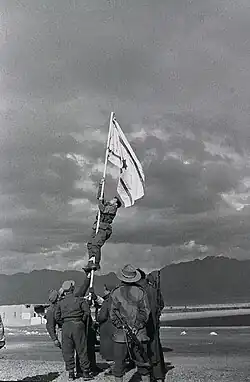Le à 15h, les forces de la brigade HaNeguev parviennent au village de pêcheurs d'Umm Rashrash, à l'ouest d'Aqaba, dans la zone du site biblique d'Elath[1]. Sur ordre de leur commandant Nahum Sarig, un drapeau improvisé est fabriqué car les soldats n'en possèdent pas dans leur paquetage[3]. Celui-ci est constitué d'un drap blanc sur lequel est cousue une étoile de David récupérée sur une trousse de secours[3],[4]. Ses deux bandes sont tracées à l'encre. Ce drapeau de fortune est dressé devant le poste de police par Avraham Adan[5], futur général israélien, alors commandant de bataillon[4]. Les soldats de la Golani arrivent 2h plus tard[1] et remplacent le drapeau improvisé par un drapeau standard[6].