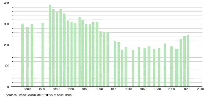 Au dernier recensement de 2013 , la commune compte 245 habitants. L'évolution du nombre d'habitants est connue à travers les recensements de la population effectués dans la commune depuis 1793. Pour les communes de moins de 10 000 habitants, une enquête de recensement portant sur toute la population est réalisée tous les cinq ans, les populations de référence des années intermédiaires étant quant à elles estimées par interpolation ou extrapolation[17]. Pour la commune, le premier recensement exhaustif entrant dans le cadre du nouveau dispositif a été réalisé en 2007[18].