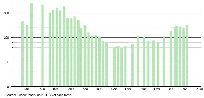 L'évolution du nombre d'habitants est connue à travers les recensements de la population effectués dans la commune depuis 1793. Pour les communes de moins de 10 000 habitants, une enquête de recensement portant sur toute la population est réalisée tous les cinq ans, les populations de référence des années intermédiaires étant quant à elles estimées par interpolation ou extrapolation[21]. Pour la commune, le premier recensement exhaustif entrant dans le cadre du nouveau dispositif a été réalisé en 2007[22].
