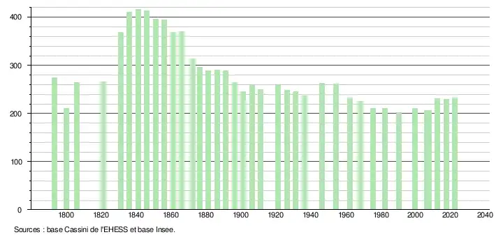 L'évolution du nombre d'habitants est connue à travers les recensements de la population effectués dans la commune depuis 1793. Pour les communes de moins de 10 000 habitants, une enquête de recensement portant sur toute la population est réalisée tous les cinq ans, les populations de référence des années intermédiaires étant quant à elles estimées par interpolation ou extrapolation[25]. Pour la commune, le premier recensement exhaustif entrant dans le cadre du nouveau dispositif a été réalisé en 2007[26].