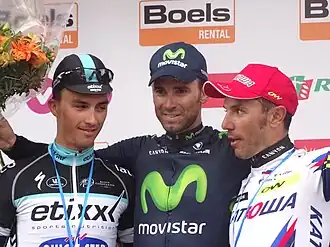 | Julian Alaphilippe ({{2e}}), Alejandro Valverde ({{1er}}) et Joaquim Rodríguez ({{3e}}). | |||