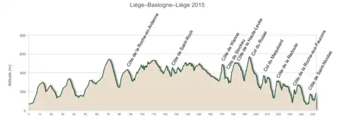 Liège-Bastogne-Liège est la dernière des trois classiques ardennaises et est la course de clôture de la saison de printemps des classiques. Les classiques ardennaises sont trois courses avec de nombreuses côtes escarpées et courtes[7]. Le tracé emmène les coureurs dès le départ à Liège au sud de Bastogne. Après 107 kilomètres, le parcours se tourne vers le nord, pour revenir à Liège. La deuxième partie de course est plus longue (146 kilomètres) et entraîne les coureurs au nord-est de Spa avant de tourner à l'ouest jusqu'à l'arrivée. La course se termine à Ans, juste à l'ouest de Liège.