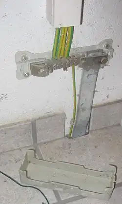 La liaison dite équipotentielle principale se trouve à l'entrée d'un bâtiment[N 1]. Elle consiste en une connexion électrique de tous les éléments métalliques du bâtiment tels que les canalisations métalliques d'alimentation d'eau, de gaz ou de chauffage accédant au bâtiment[N 1] ainsi que toutes les pièces de la charpente métallique de ce même bâtiment[N 1],[1][source secondaire souhaitée] ; cette liaison équipotentielle est reliée à la terre du bâtiment[N 1] et est vérifiée régulièrement.