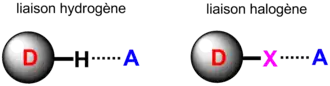 Une analogie existe entre la liaison halogène (XB) et la liaison hydrogène (HB)[1]. Dans les deux cas de liaisons, il s'agit d'une interaction entre un donneur d'électron et un accepteur d'électron. La différence entre les deux formes d'interaction réside dans la nature du site donneur. Dans le cas de la liaison hydrogène, l'hydrogène est l'accepteur d'électron et interagit de manière non-covalente en acceptant une densité électronique de la part d'une espèce riche en électron (exemple l'interaction O-H...O dans l'eau). Tandis que dans le cas de la liaison halogène, l'atome d'halogène est l'accepteur d'électron. Les transferts électroniques entre les deux espèces provoquent l'interpénétration des volumes de van der Waals[2].