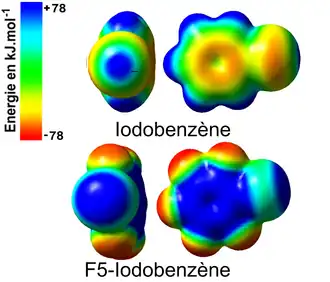 Les calculs théoriques ab-initio permettent d'accéder à de nombreux paramètres électroniques au sein des édifices moléculaires halogénés tels que les charges partielles des atomes, la densité électronique, les distances interatomiques, la polarisabilité, etc. En effet, l'étude de la répartition de la densité électronique et les surfaces de potentiels électrostatiques des dérivés halogénés montrent l'existence d'une zone chargée positivement à la surface des halogènes fortement polarisables tels que l'iode (I) ou le brome (Br). Cette zone est appelée trou σ (sigma). L'apparition du trou σ peut être corrélée avec l'effet inductif attracteur qu'exercent les atomes ou les groupements d'atomes sur le nuage électronique de l'halogène en question. Ainsi, par exemple, l'étude de distribution de la densité électronique à la surface de l'iodobenzène et du pentafluoroiodobenzène en se fondant sur la théorie de la perturbation de Møller-Plesset du second ordre (MP2)[11] suivie par la cartographie de la répartition de la densité à la surface de ces molécules (surface de van der Waals ~ 0.002e/Å2) révèle une zone centrée autour de l'axe de la liaison C-I où l'iode est polarisé positivement (zone bleu) et le noyau aromatique a une forte densité électronique ainsi que les atomes de fluor (zone rouge). L'augmentation de l'effet attracteur par la substitution des hydrogènes par des fluors accentue et augmente la taille du trou σ.