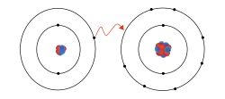 Configuration électroniques du lithium et du fluor. Le lithium a un électron dans sa couche de valence alors que le fluor en a sept. Si un électron est transféré du lithium au fluor, les deux atomes deviennent des ions qui possèdent la configuration électronique d'un gaz rare. Ces deux ions de charge opposée s'attirent d'où le concept de liaison ionique.