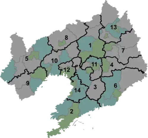 | 9 | 211400 | Huludao | 10 415 km2 | 2 623 541 | District de Longgang | 3 | 2 | 1 | |||