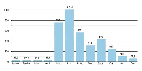 Le débit moyen mensuel observé en mars (minimum d'étiage) atteint 23,2 m3/s, soit moins de 2,5 % du débit moyen du mois de juin (1 010 m3/s), ce qui illustre l'amplitude très élevée des variations saisonnières. Sur la période d'observation de 14 ans, le débit mensuel minimal a été de 10,8 m3/s en , tandis que le débit mensuel maximal s'est élevé à 1 480 m3/s en .