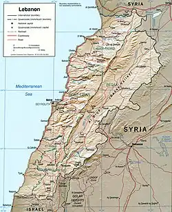 Le Liban (en arabe : لبنان / lubnān), en forme longue la République libanaise[6],[7] (en arabe : الجمهورية اللبنانية / al-jumhūriyya al-lubnāniyya), est un État du Proche-Orient. En grande partie montagneux, il partage ses frontières avec la Syrie au nord et à l'est sur 376 km, Israël au sud sur 79 km et Chypre à l'ouest, à environ 200 km au large de ses 255 km de côtes dans le bassin Levantin (partie orientale de la mer Méditerranée)[8]. Beyrouth est la capitale et la plus grande ville du pays.