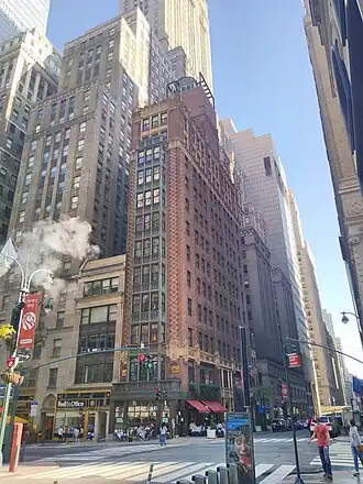 Le bâtiment du Library Hotel est un ancien immeuble de bureaux, construit en 1912 dans un esprit gothic revival, avec des façades alliant entre autres la brique et la terre cuite[5].