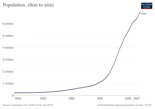 Elle s'étend sur 1 759 540 km2, ce qui la place au quatrième rang africain et au dix-huitième rang mondial. Sa population est estimée entre 6 et 8 millions d'habitants. Elle se concentre sur les côtes, l'intérieur du pays étant désertique. Sa capitale, Tripoli, sur la côte méditerranéenne, est également sa plus grande agglomération (1,1 million d'habitants), devant Misrata (1 million d'habitants)), Benghazi (plus de 631 000 habitants[7]) et El Beïda (250 000 habitants[8]).