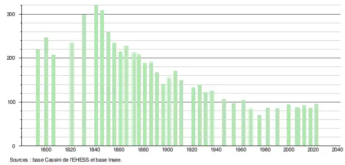 L'évolution du nombre d'habitants est connue à travers les recensements de la population effectués dans la commune depuis 1793. Pour les communes de moins de 10 000 habitants, une enquête de recensement portant sur toute la population est réalisée tous les cinq ans, les populations de référence des années intermédiaires étant quant à elles estimées par interpolation ou extrapolation[30]. Pour la commune, le premier recensement exhaustif entrant dans le cadre du nouveau dispositif a été réalisé en 2007[31].