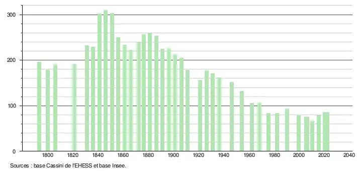 L'évolution du nombre d'habitants est connue à travers les recensements de la population effectués dans la commune depuis 1793. Pour les communes de moins de 10 000 habitants, une enquête de recensement portant sur toute la population est réalisée tous les cinq ans, les populations de référence des années intermédiaires étant quant à elles estimées par interpolation ou extrapolation[51]. Pour la commune, le premier recensement exhaustif entrant dans le cadre du nouveau dispositif a été réalisé en 2005[52].