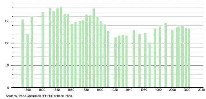 L'évolution du nombre d'habitants est connue à travers les recensements de la population effectués dans la commune depuis 1793. Pour les communes de moins de 10 000 habitants, une enquête de recensement portant sur toute la population est réalisée tous les cinq ans, les populations de référence des années intermédiaires étant quant à elles estimées par interpolation ou extrapolation[41]. Pour la commune, le premier recensement exhaustif entrant dans le cadre du nouveau dispositif a été réalisé en 2008[42].