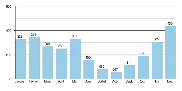 Sur cette courte période d'observation, le débit journalier maximal a été observé le pour 11,20 m3/s. Le débit instantané maximal a été observé le [notes 1] avec 14 m3/s et la hauteur maximale instantanée de 214 cm soit 2,14 m le [notes 2],[2].