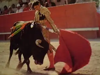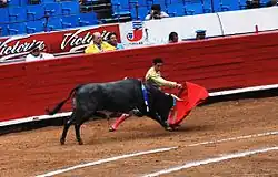 Le taureau, contrairement à une idée reçue, n'est pas provoqué par la vue d'une couleur vive. Il peut être toréé aussi bien avec une serviette ou un imperméable[8]. En 1928, Manolo Bienvenida et Pepe Bienvenida toréèrent deux jours au Madison Square Garden de New York en utilisant des étoffes vertes imposées par les sociétés protectrices des animaux. Cette innovation n'apporta aucun changement dans le jeu habituel. Le taureau fonce sur ce qui bouge, dans la direction du déplacement de l'objet, pour l'attraper au passage (dès son plus jeune âge, il a vu tout ce qui attaquait en plein champ : bêtes à cornes, piéton, cavalier)[8]. L'art du torero consiste donc à attirer le taureau en provoquant sa charge par un toque (« mouvement ») plus accentué de la muleta. Un toque de qualité est donné à un moment précis, sans hésitation, et sans brusquerie[7]. Si le taureau a du mal à charger, cela signifie qu'il se fatigue et qu'il s'essouffle. Dans ce cas, la lidia n'a pas été adaptée aux capacités de l'animal[9].