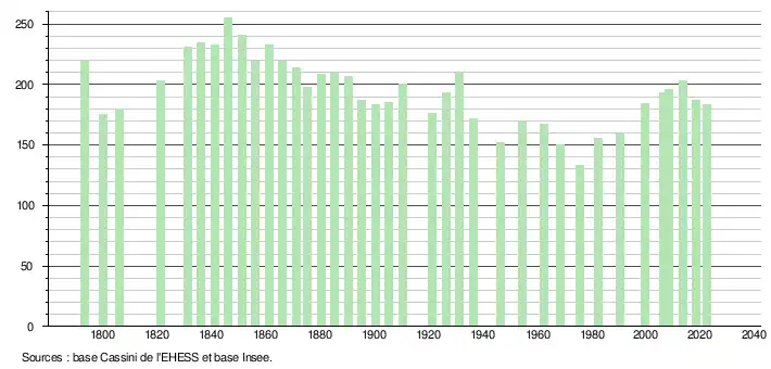 L'évolution du nombre d'habitants est connue à travers les recensements de la population effectués dans la commune depuis 1793. Pour les communes de moins de 10 000 habitants, une enquête de recensement portant sur toute la population est réalisée tous les cinq ans, les populations de référence des années intermédiaires étant quant à elles estimées par interpolation ou extrapolation[17]. Pour la commune, le premier recensement exhaustif entrant dans le cadre du nouveau dispositif a été réalisé en 2008[18].