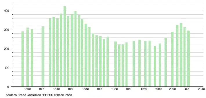 L'évolution du nombre d'habitants est connue à travers les recensements de la population effectués dans la commune depuis 1793. Pour les communes de moins de 10 000 habitants, une enquête de recensement portant sur toute la population est réalisée tous les cinq ans, les populations de référence des années intermédiaires étant quant à elles estimées par interpolation ou extrapolation[17]. Pour la commune, le premier recensement exhaustif entrant dans le cadre du nouveau dispositif a été réalisé en 2006[18].