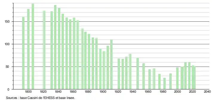 L'évolution du nombre d'habitants est connue à travers les recensements de la population effectués dans la commune depuis 1793. Pour les communes de moins de 10 000 habitants, une enquête de recensement portant sur toute la population est réalisée tous les cinq ans, les populations de référence des années intermédiaires étant quant à elles estimées par interpolation ou extrapolation[17]. Pour la commune, le premier recensement exhaustif entrant dans le cadre du nouveau dispositif a été réalisé en 2005[18].