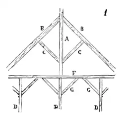 A étant le poinçon et B les arbalétriers, les pièces C sont des liens ; D étant des poinçons et F le faîtage, les pièces G sont des liens.