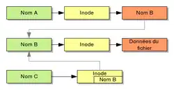 On appelle déréférencement l'action du système d'exploitation consistant à remplacer à la volée le nom du lien symbolique par celui qu'il pointe.