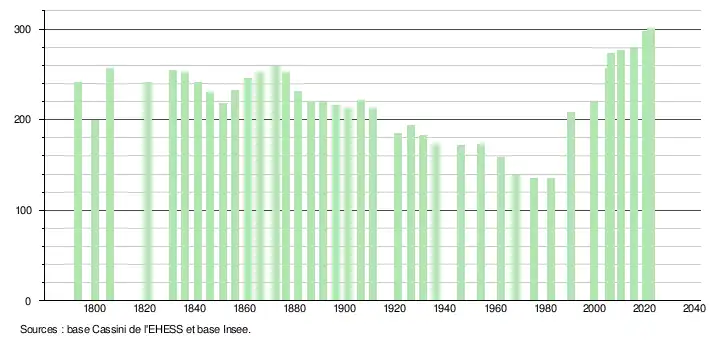 L'évolution du nombre d'habitants est connue à travers les recensements de la population effectués dans la commune depuis 1793. Pour les communes de moins de 10 000 habitants, une enquête de recensement portant sur toute la population est réalisée tous les cinq ans, les populations de référence des années intermédiaires étant quant à elles estimées par interpolation ou extrapolation[30]. Pour la commune, le premier recensement exhaustif entrant dans le cadre du nouveau dispositif a été réalisé en 2005[31].