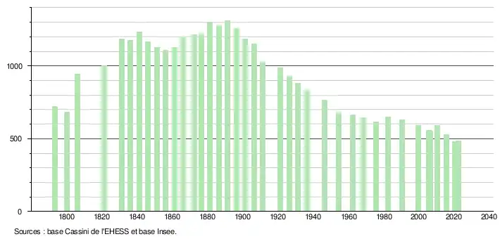 L'évolution du nombre d'habitants est connue à travers les recensements de la population effectués dans la commune depuis 1793. Pour les communes de moins de 10 000 habitants, une enquête de recensement portant sur toute la population est réalisée tous les cinq ans, les populations de référence des années intermédiaires étant quant à elles estimées par interpolation ou extrapolation[20]. Pour la commune, le premier recensement exhaustif entrant dans le cadre du nouveau dispositif a été réalisé en 2005[21].