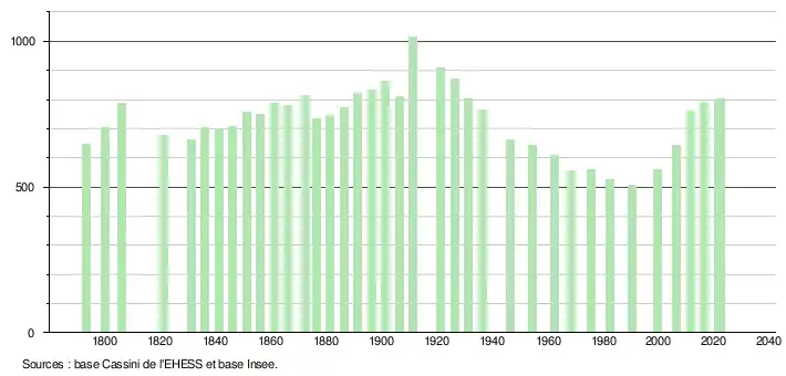 L'évolution du nombre d'habitants est connue à travers les recensements de la population effectués dans la commune depuis 1793. Pour les communes de moins de 10 000 habitants, une enquête de recensement portant sur toute la population est réalisée tous les cinq ans, les populations de référence des années intermédiaires étant quant à elles estimées par interpolation ou extrapolation[25]. Pour la commune, le premier recensement exhaustif entrant dans le cadre du nouveau dispositif a été réalisé en 2006[26].