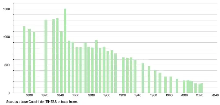 L'évolution du nombre d'habitants est connue à travers les recensements de la population effectués dans la commune depuis 1793. Pour les communes de moins de 10 000 habitants, une enquête de recensement portant sur toute la population est réalisée tous les cinq ans, les populations de référence des années intermédiaires étant quant à elles estimées par interpolation ou extrapolation[14]. Pour la commune, le premier recensement exhaustif entrant dans le cadre du nouveau dispositif a été réalisé en 2004[15].