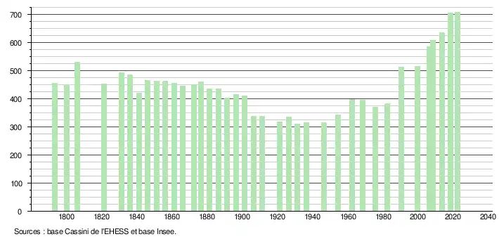 L'évolution du nombre d'habitants est connue à travers les recensements de la population effectués dans la commune depuis 1793. Pour les communes de moins de 10 000 habitants, une enquête de recensement portant sur toute la population est réalisée tous les cinq ans, les populations de référence des années intermédiaires étant quant à elles estimées par interpolation ou extrapolation[34]. Pour la commune, le premier recensement exhaustif entrant dans le cadre du nouveau dispositif a été réalisé en 2008[35].