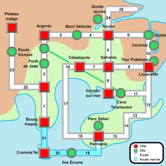 - Carmin-sur-Mer : Ville portuaire où se trouve le quai qui accueille l'Océane un bateau de croisière, le fan club Pokémon, un centre Pokémon, un magasin d'objet, un bureau de police et l'arène de type Électrik du Major Bob. Le badge Foudre peut y être obtenu. Elle représente Yokohama.