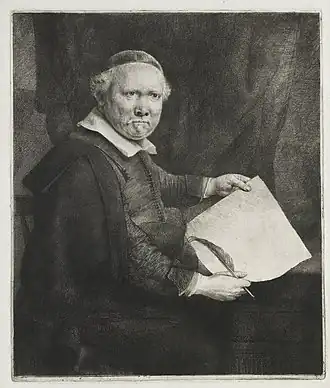 - Portrait de Coppenol peint par Rembrandt, préparatoire à la grande planche. Voir ici.