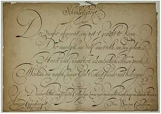 - Vlieghende capitalen ofte voorletteren, dienende tot behulp ende voorderinghe van alle schoolmeesters ende beminders der pennen. Wytghegheven door Jan vanden Velde, Francoysche Schoolm[eester] binnen de wÿtberoemde en konstrÿcke stadt Haerlem, Ende int koper ghesneden door M. Lieven Willems Koppenol Francoysche Schoolm[eester] binne Amsterd. Anno 1619. London BM. Voir une [page https://www.britishmuseum.org/research/collection_online/collection_object_details/collection_image_gallery.aspx?assetId=59798&objectId=761752&partId=1 ici].
