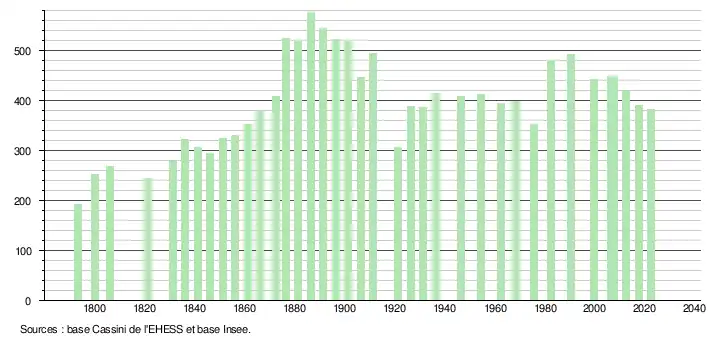 L'évolution du nombre d'habitants est connue à travers les recensements de la population effectués dans la commune depuis 1793. Pour les communes de moins de 10 000 habitants, une enquête de recensement portant sur toute la population est réalisée tous les cinq ans, les populations de référence des années intermédiaires étant quant à elles estimées par interpolation ou extrapolation[22]. Pour la commune, le premier recensement exhaustif entrant dans le cadre du nouveau dispositif a été réalisé en 2007[23].