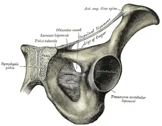 Le ligament pectiné est tendu sur le pecten du pubis entre le tubercule pubien et l'éminence iliopubienne.
