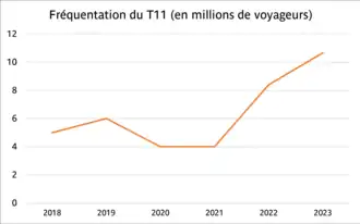 En 2000, le trafic estimé se situait entre 100 000 et 150 000 voyageurs par jour sur le tracé complet. En 2008, le trafic estimé est revu à la hausse avec 150 000 voyageurs par jour[5]. En 2017, le site officiel du T11 évoque jusqu'à 250 000 voyageurs[28], mais la première phase vise dans un premier temps 60 000 voyageurs par jour[29].