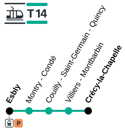 Le tramway T14 circule en intégralité sur la ligne d'Esbly à Crécy-la-Chapelle. La ligne, longue de 9,9 km, dessert les communes d'Esbly, Montry, Saint-Germain-sur-Morin et Crécy-la-Chapelle.