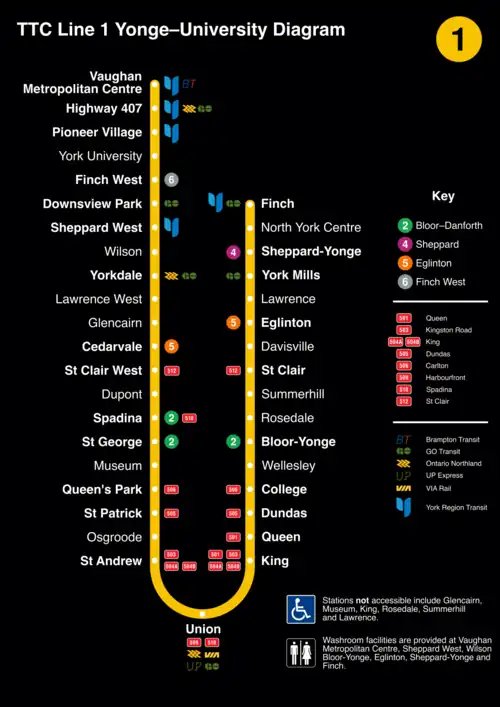 La ligne 1 Yonge-University est une des quatre lignes du réseau métropolitain de Toronto. Cette première ligne torontoise et canadienne, dont le premier tronçon est ouvert en 1954, relie aujourd'hui la station Vaughan Metropolitan Centre, au nord-ouest, à la station Finch, au nord-est, et suit un axe en « U » suivant doublement une direction nord-sud sous la rue Yonge, la gare Union et rejoignant Vaughan. Avec une longueur de 38,8 kilomètres, elle constitue une voie de communication nord-sud-nord majeure pour la ville en desservant entièrement le centre-ville et l'axe de la rue Yonge : c'est la ligne de métro la plus fréquentée du réseau avec 280 millions de voyageurs par an et en moyenne près de 795 000 voyageurs par jour en 2018.