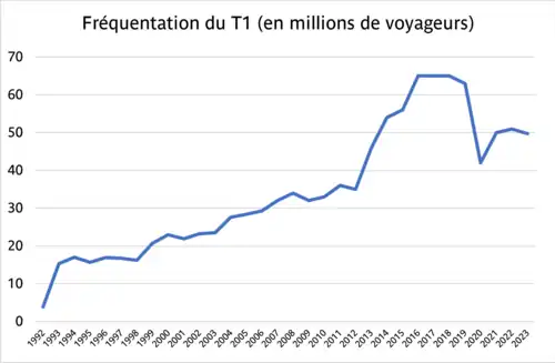 La ligne T1 dessert depuis cette date vingt-six stations et transporte en moyenne 100 000 voyageurs chaque jour ouvrable en 2003[a 6], fréquentation qui atteint en semaine 115 000 voyageurs par jour en 2008[9].