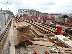 Vue des travaux de renouvellement des voies à l'été 2010 à Basilique de Saint-Denis, sur pose antivibratile renforcée.