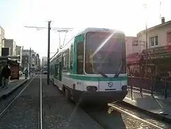 La rame TFS no 116 sur l'ancien quai central de la station Hôtel de Ville de La Courneuve, en .